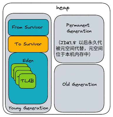 - 把内存分配的动作按线程划分在不同的空间进行,即每个线程在堆先分配一小块内存,称为本地线程分配缓冲(Thread Local Allocation Buffer,TLAB);先在线程自身的TLAB上分配,只有当TLAB使用完分配新的TLAB时,才需要同步锁定。