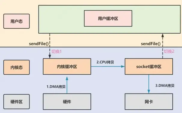 在第二步中不需要将数据从操作系统内核缓冲区拷贝到 socket 缓冲区中,这样就减少了一次数据拷贝; 所以,这个过程之中,只进行了 2 次数据拷贝。
