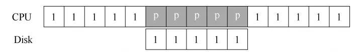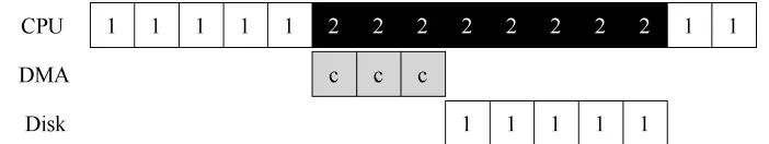 标准协议还有一点需要我们注意。具体来说,如果使用编程的 I/O 将一大块数据传给设备,CPU 又会因为琐碎的任务而变得负载很重,浪费了时间和算力,本来更好是用于运行其他进程。下面的时间线展示了这个问题: