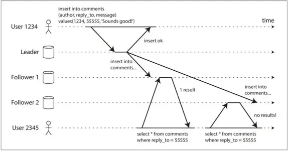 以Read Your Writes为例进行介绍,在最常见的基于领导者的复制系统中,如果用户在写入后马上就查看数据,则新数据可能尚未到达副本。对用户而言,看起来好像是刚提交的数据丢失了。在这种情况下我们需要Read Your Writes一致性。