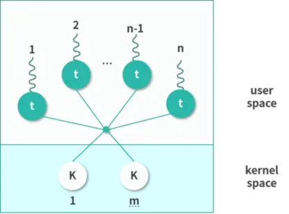 这种模式下会为 n 个用户态线程分配 m 个内核态线程。m 通常可以小于 n。一种可行的策略是将 m 设置为核数。这种多对多的关系,减少了内核线程,同时也保证了多核心并发。Linux 目前采用的就是该模型。