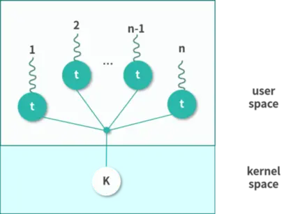 用户态进程中的多线程复用一个内核态线程。这样,极大地减少了创建内核态线程的成本,但是线程不可以并发。因此,这种模型现在基本上用的很少。
