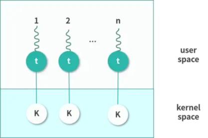 该模型为每个用户态的线程分配一个单独的内核态线程,在这种情况下,每个用户态都需要通过系统调用创建一个绑定的内核线程,并附加在上面执行。 这种模型允许所有线程并发执行,能够充分利用多核优势,Windows NT 内核采取的就是这种模型。但是因为线程较多,对内核调度的压力会明显增加。