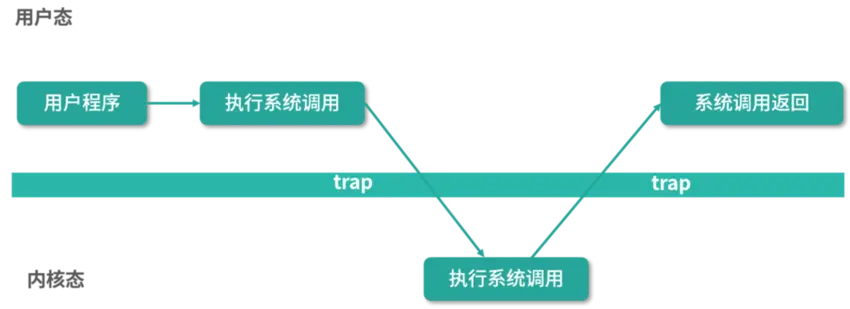 内核程序执行在内核态(Kernal Mode),用户程序执行在用户态(User Mode)。当发生系统调用时,用户态的程序发起系统调用。因为系统调用中牵扯特权指令,用户态程序权限不足,因此会中断执行,也就是 Trap。发生中断后,当前 CPU 执行的程序会中断,跳转到中断处理程序。内核程序开始执行,也就是开始处理系统调用。内核处理完成后,主动触发 Trap,这样会再次发生中断,切换回用户态工作。