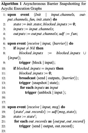 - 从这个时间点开始,这个节点将从back-edges收到的所有record记录下来,直到收到来自相应的barrier(算法26行)。