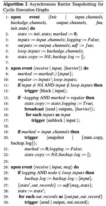 首先通过静态分析在执行图的循环中定义一个back-edges集合 L,根据控制流图理论,一个有向图中,一个back-edge是一个指向已经在深度优先搜索中被访问的点(vertex)和边(edge)。定义执行图G(T,E\L)是一个包含拓扑中所有task的有向无环图(DAG)。从这个 DAG 的⻆度来看,算法像以前⼀样运⾏,但是,我们还在快照期间对从已识别的back-edges接收到的记录进⾏下游备份。对于 $L_{t} \subset I_{t}$ ,$L_t$ 的每个消费者任务 t 实现了上述逻辑,从 $L_{t}$ 转发barrier的那⼀刻起,直到从 $L_{t}$ 接收到它们,它创建从 $L_t$ 接收到的所有记录的⽇志备份。屏障将循环传输中的所有记录推送到下游⽇志中,因此它们在⼀致快照中包含⼀次。