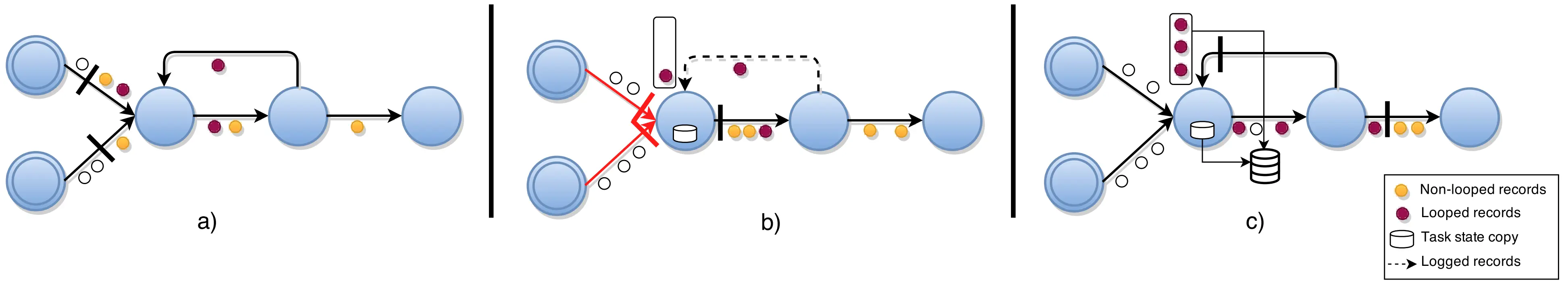- 如图中c,所有循环中的pre-shot records和状态的备份都被作为快照的一部分。意味着最终的全局状态 $G^{} = (T^{},L^{})$ 包含所有task状态和仅在传输中的back-edge records $L^{} \subset E^{*}$