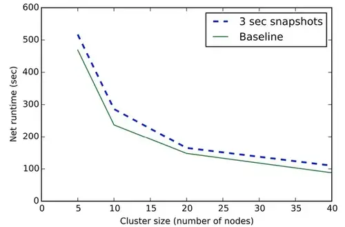 我们测试了不同方案的快照运行时开销,ABS与同步方式快照。在Apache Flink上实现了Naiad中采用的同步快照算法,为了让这个比较有相同的执行后端。这个实验跑在10节点集群上。为了评估算法的可扩展性 我们处理固定数量的数据。同时将并行度从5个增加到40个。