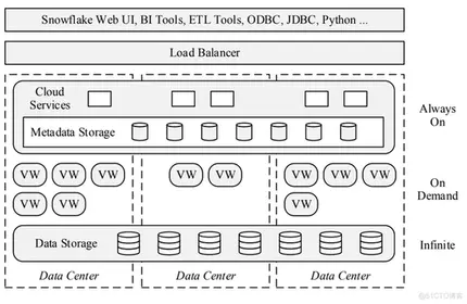 Snowflake是给企业提供现成的服务。除了提供高可用性和操作性之外,企业使用就意味着高可用性。为此,Snowflake是一个面向服务的体系结构,由高度容错和独立可扩展的服务组成。这些服务通过RESTful接口进行通信,分为三个体系结构层: